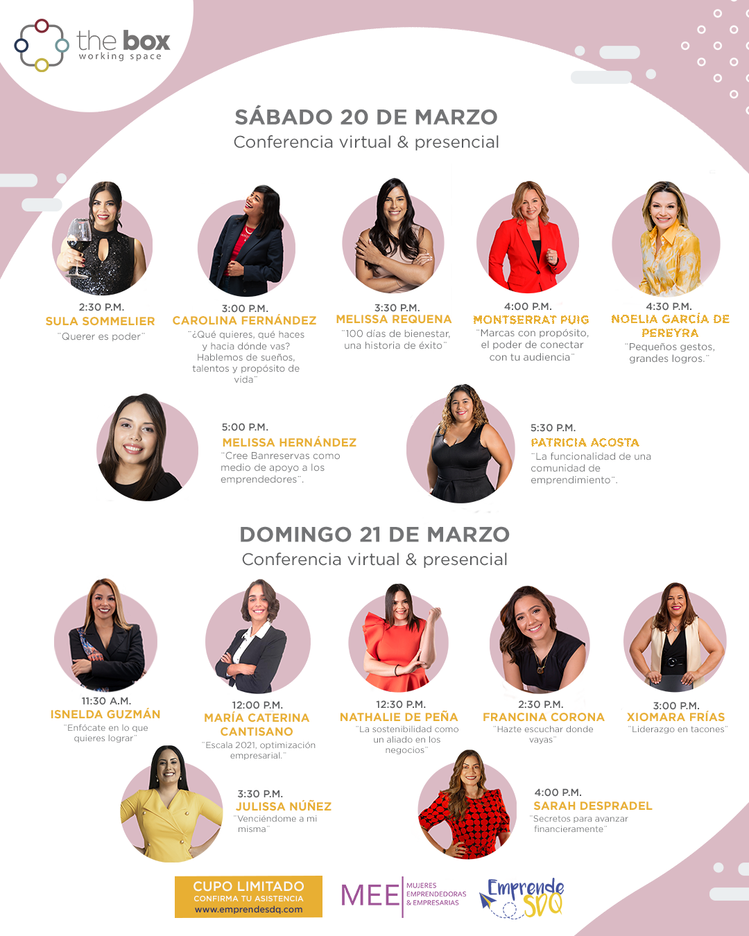 Este año el MEE se realizará el sábado 20 y el domingo 21 de marzo. Contará con las ponencias de Sula Sommelier, Carolina Fernández, Melissa Requena, Montserrat Puig, Noelia García de Pereyra, Melissa Hernández, Patricia Acosta, Isnelda Guzmán, María Caterina Cantisano, Nathalie de Peña, Francina Corona, Xiomara Frías, Julissa Núñez y Sarah Despradel.